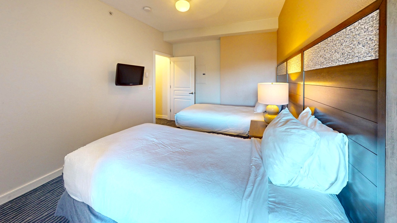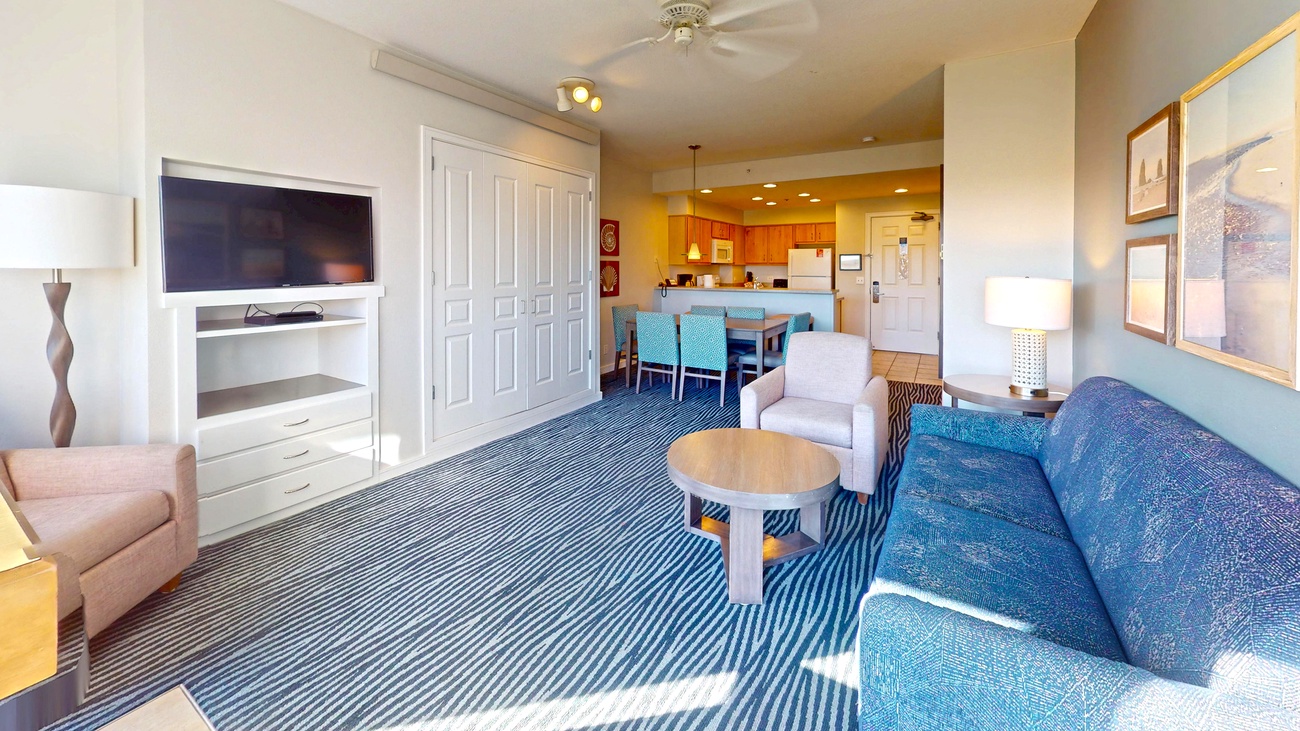 The two bedroom, two bath standard units are generally located on the lower floors and may have little or partial views of the ocean and beach. These units are approximately 900 square feet and are limited to 6 guests. They offer a complete kitchen, living and dining room, fireplace, balcony, and jetted tub. Each is furnished with a king bed, two twins, and a queen Murphy bed in the living room. The twins may be combined to make a larger bed if requested.