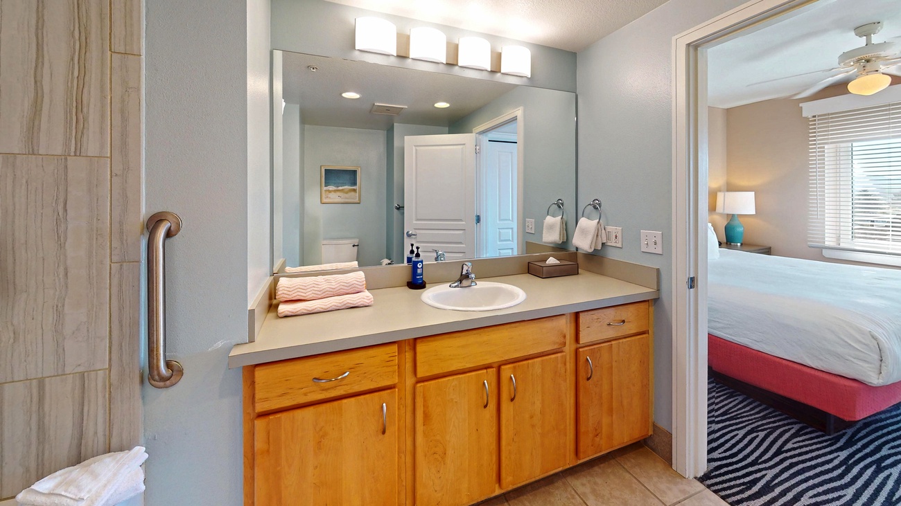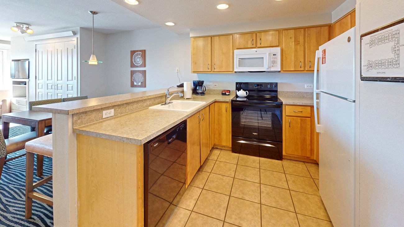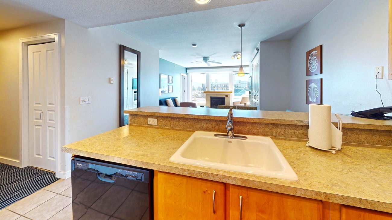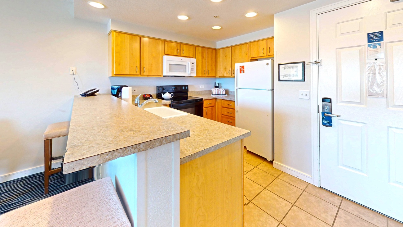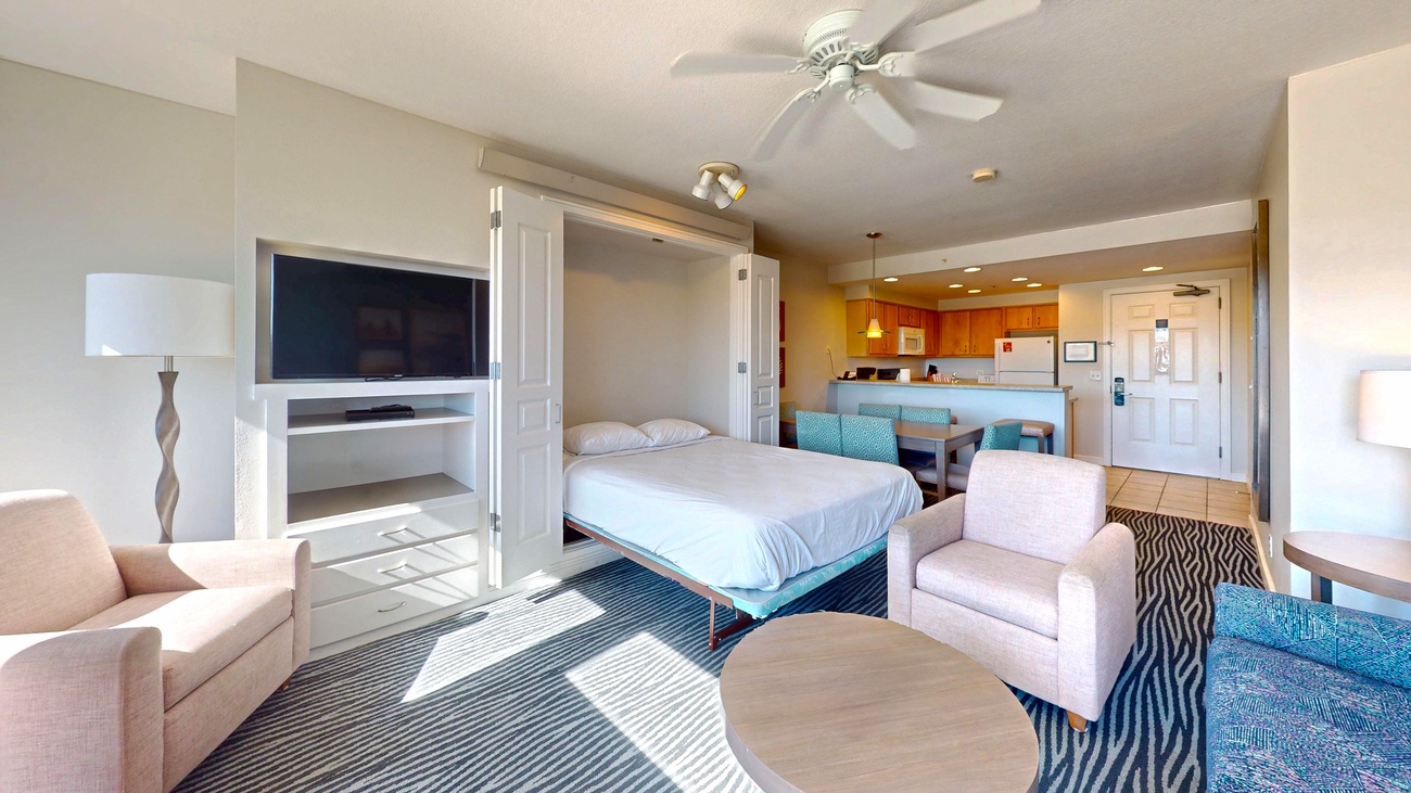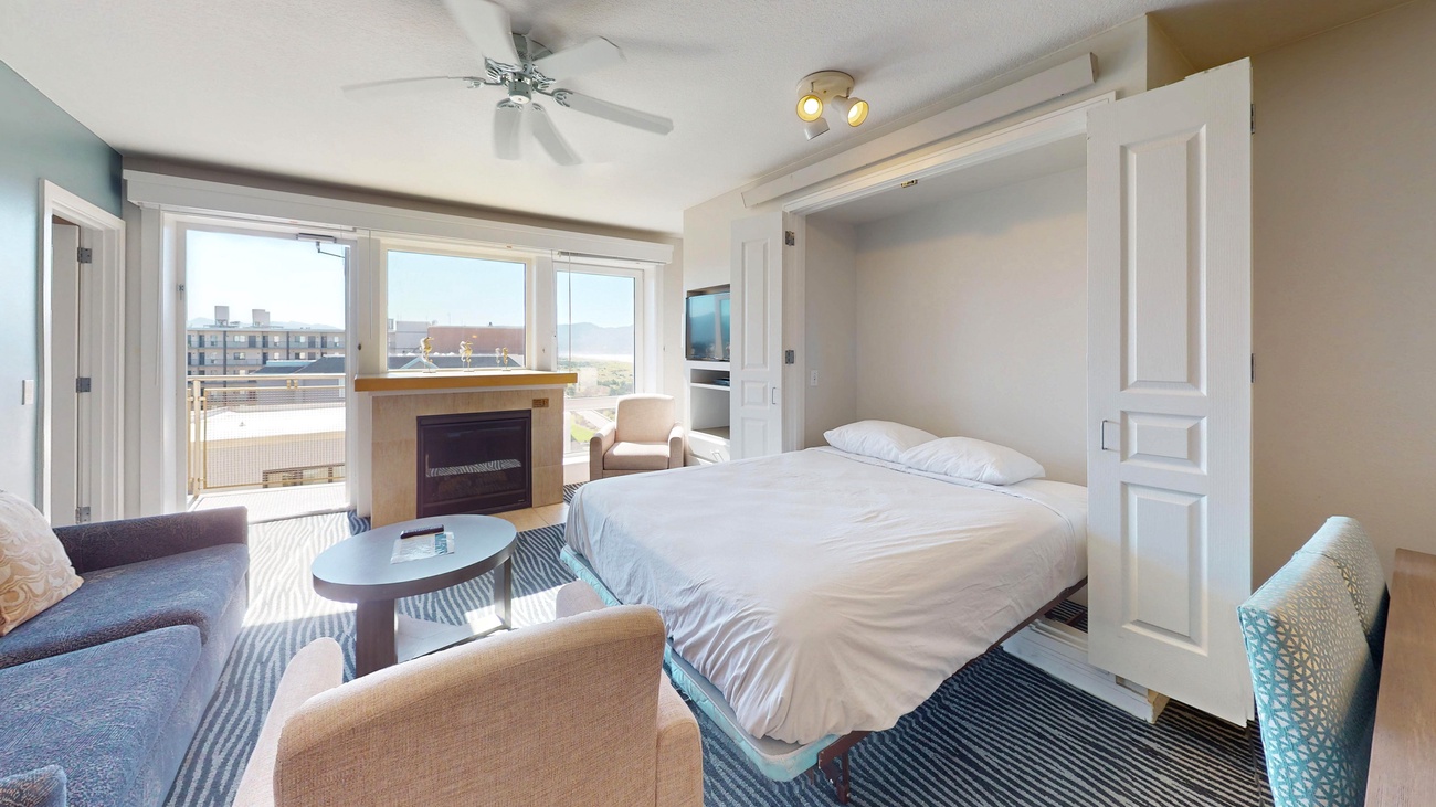 The deluxe units are located on the upper four floors of the eight-story building and offer views of the ocean and beach from the balcony, and from inside in most of them. These units are approximately 1050 square feet and are limited to 8 guests. They feature a complete kitchen, living and dining room, fireplace, balcony, and jetted tub. Each is furnished with a king bed, a queen bed, two twins, and a queen Murphy bed in the living room. The twins bed may be combined to form a larger bed if requested.