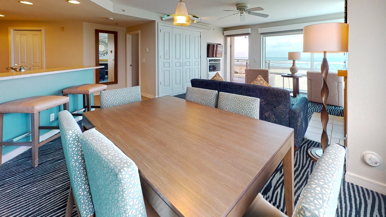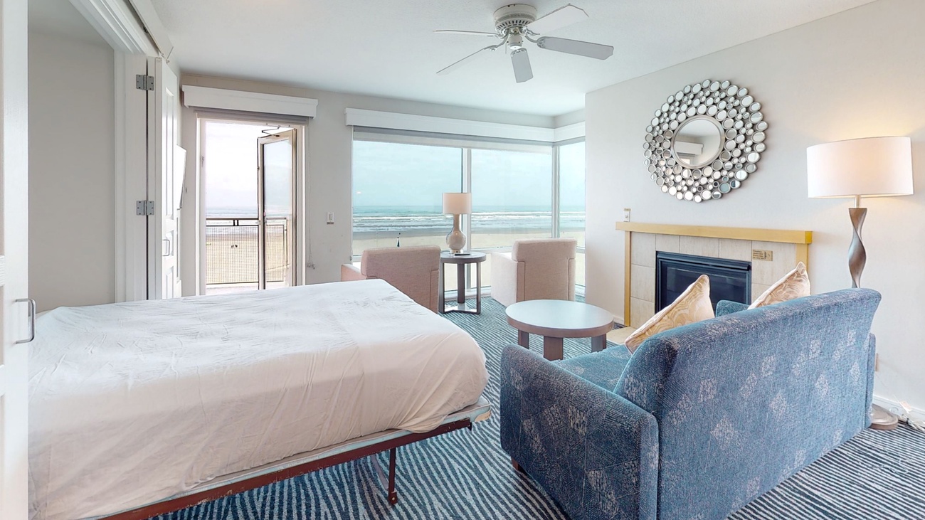 The two bedroom, two bath, ocean front condos are located on the NW corner of the building overlooking the Turnaround with spectacular views of the coastline from Tillamook Head to Washington State. They are approximately 1150 sq. ft. and can sleep 6 guests. The units offer a complete kitchen, living and dining room, fireplace, balcony and jetted tub. They are furnished with a king, two twins, and a queen Murphy bed in the living area. The twins may be combined to make a larger if requested.